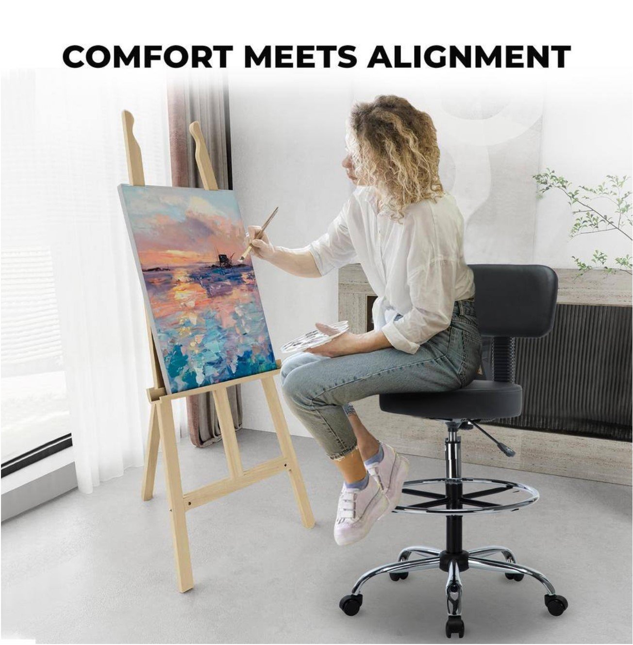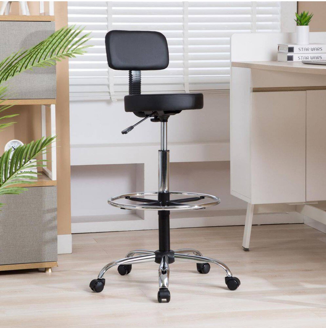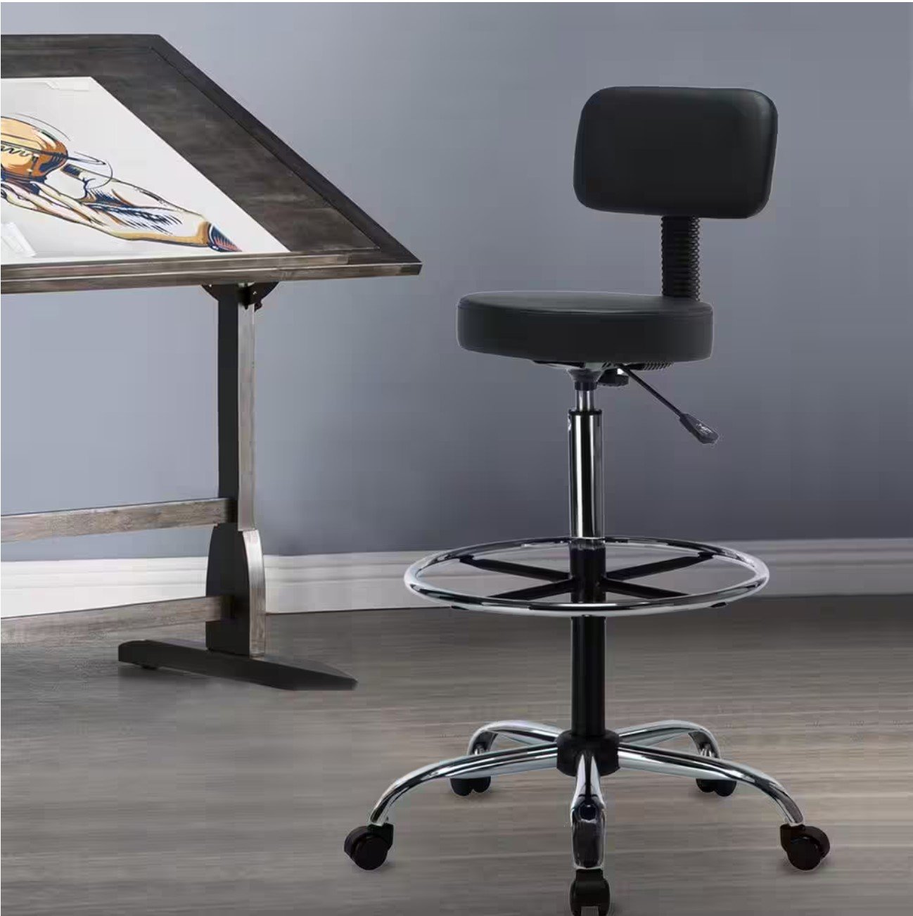 Ergonomic Comfort for Standing Desk Setups Enhance your workspace with this tall desk chair, specifically designed for use with standing desks and elevated workstations. Featuring thick padding and a supportive backrest, it promotes healthy posture and relieves pressure on your legs with its integrated footrest. Whether for a home office or a professional setting, this ergonomic chair offers both style and practical comfort.Smooth mobility for active workspaces built with a durable star-shaped base and smooth-rolling wheels, this drafting chair allows effortless movement across your workspace, it’s perfect for creative environments or any setup where mobility and support are essential, enjoy the flexibility of a rolling stool with dependable back support.Versatile for multiple uses from home office to studio, vanity station to shop floor, this chair transitions effortlessly, use it as a director’s chair, drafting stool, or vanity seat – its compact yet functional design makes it a smart and stylish choice for a variety of spaces