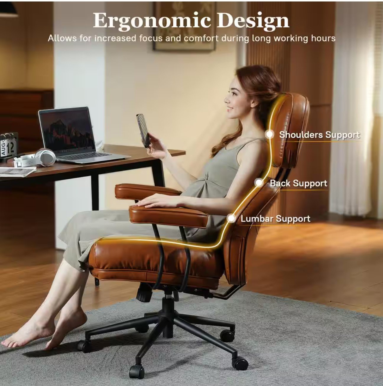 - Comfortable ergonomic chair, the frame of the executive office chair is made of solid wood multilayer and bentwood craftsmanship for a solid structure, the backrest is designed to fit the ergonomic spine curvature, providing support for your spine and head, and more importantly, the upholstered armrests provide extra support for your arms